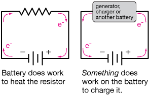 When current flows the other way, we say that the system is doing work on the circuit, perhaps charging the battery, if that's chemically possible.