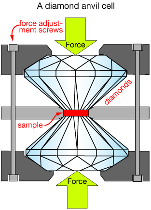 In the laboratory, it is possible to study extremely high pressures. A typical way to do that is the so-called "diamond anvil cell," shown here.