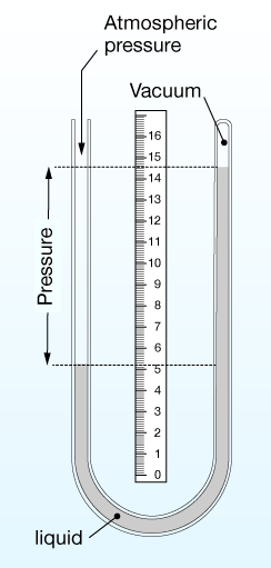 In the device illustrated here, any pressure on the open (left) side of the tube will push the liquid down. We can measure the difference between the column heights to calculate that pressure.