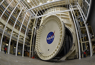 The chamber shown in this photo is a vacuum chamber. NASA uses it to simulate the vacuum of space. When the round door is closed, pumps can be activated to suck all of the gases out to reduce the inside pressure to nearly zero (choose your own pressure unit).