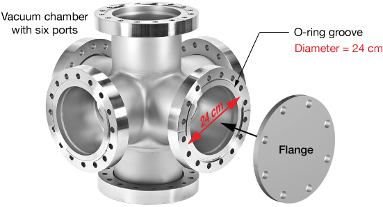 A vacuum chamber has an opening (a "port") with a diameter of 24 cm, fitted with a rubber O-ring that seals to a flange that covers the port. If the pressure outside the chamber is 1 atm., and a vacuum of 200 mtorr (1000 mtorr = 1 torr) is produced inside of the chamber, calculate the total force holding the flange in place.