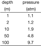 This force is equal to the pressure because we chose an area of 1 m2. Here are some typical pressures that a diver would experience at depths between 1 and 100 meters below the surface of the water.
