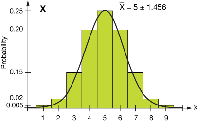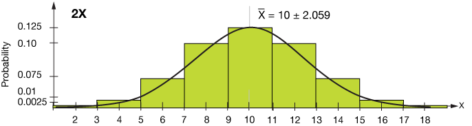 Now let's take that entire distribution and multiply it by 2. That amounts to multiplication of both the mean and the variance ( σ2 ) by 2. The new mean and variance are $\bar X = 10$ and $\sigma^2 = 4.239$. The variance of the original distribution is 1.4562 = 2.119, so we can see that when we multiply a distribution by 2, we double the mean and we double the variance. Be cautious, though, the standard deviation doesn't double, but is multiplied by the square root of 2.