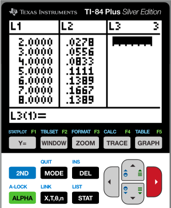 The mean and standard deviation of discrete random data can be found using lists and the [STAT] functions on a TI-84 calculator. Here are the steps using the dice data from above.