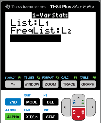 Choose the 1-var stats function and enter the X-data in the List: space using [2nd]+L1. Likewise, enter the probabilities into the FreqList: space.