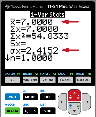 Then hit calculate and you'll see (red arrows) your mean and σ.