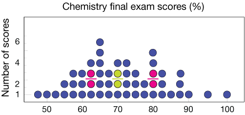 The first and third quartiles are the averages of the 13th and 14th points (Q1 = 62.5) and of the 39th and 40th points (Q3 = 80). The IQR is then 80 - 62.5 = 17.5. We can check for outliers: