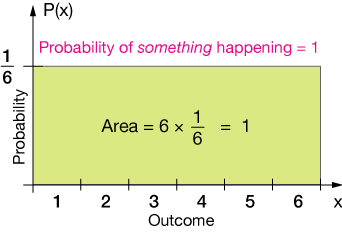 The total probability must sum to 1. In this case, we have six possible outcomes, each with a ⅙ probability, so the total area of our rectangular probability distribution graph (below) is 1. We would refer to this as a normalized distribution.
