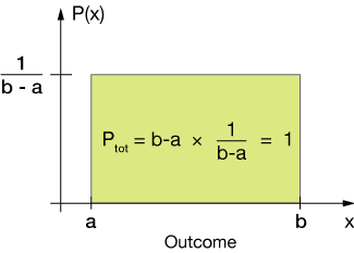 We might also have a uniform distribution of continuous outcomes, where our probability experiment could give any result between x = a and x = b, with equal likelihood, as in the graph below.