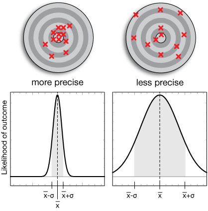 The width of a distribution corresponds to the precision of the data. A distribution that is narrow means that there is a low probability of values far from the mean or median. A wider distribution means that data points far from the middle are more probable. Consider these two distributions of the distance of each dart from the bullseye of a dart board: