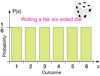 The uniform probability distribution is one in which the probability of any outcome of a probability "experiment" is the same. A good example is the rolling of a single fair die, where "fair" means an equal chance of rolling 1, 2, 3, 4, 5 or 6.