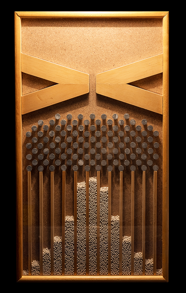 A good example of how a discrete distribution merges into a continuous distribution is the Galton board, something you might have seen in a science museum. In this example, about a thousand marbles are dropped from the triangular compartment at the top of the board through the narrow opening, randomly striking the dowels below. Most of the marbles drop in a straighter downward path, but some drop to the left and right sides – with decreasing likelihood as they get farther from the center. After many marbles drop, the pattern of the normal distribution becomes clear. This happens time after time with the Galton board, but never with precisely the same result &ndash there's always some "noise". The more marbles, the closer to normal or Gaussian the distribution of heights will be, and if we were to average the shape of the distribution over many trials, it would smooth out nicely into the continuous function that is the Normal or Gaussian distribution.