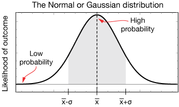 The height of the normal curve represents the probability of some event occuring or of finding some value of the data. High means likely and low means unlikely. The standard Gaussian curve is left-right symmetric, and the mean and median of the data are the same – right in the middle. Gaussian distributions can be very narrow or very spread out, representing high or low precision of the data, respectively.