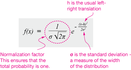 This function might look complicated, but think of the first part as a constant prefactor. Then the exponential function is a symmetric bell-shaped curve that's translated by -h units along the x-axis and scaled by the 2σ2 in the denominator.