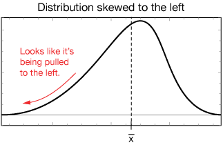 Not all distributions are symmetric. Some are skewed one direction or another. We say that the distribution below is "skewed to the left" because it looks like it's being dragged to the left by its left-most point or "tail."