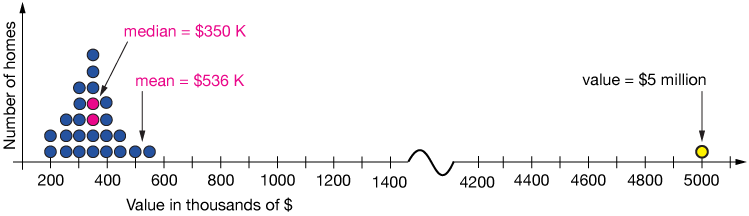Now let's do a little thought experiment. Imagine that a family comes into this community and builds a \$5-million home. What will that do to the mean and median? The graph below shows the picture. Notice that the \$5-million home is such an outlier that the horizontal axis has to have a little bit cut out to show it.