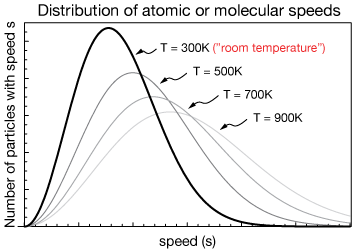Just as a quick example of an important skewed distribution, the distribution of atomic or molecular speeds in any sample of a gas has the Maxwell-Boltzmann distribution shown below, a distinctly right-skewed distribution that varies with the temperature of the sample.