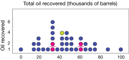 Let's use dot plot below, illustrating the number of barrels of oil recovered per year from 37 wells in an oil field, to calculate some quartiles and find the IQR.