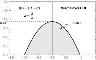 $$ \begin{align} f(x) &= a(1 - x^2) \tag{1} \\[5pt] a \int_{-1}^1 \, (1 - x^2) dx &= 1 \tag{2} \\[5pt] a \bigg[ x - \frac{x^3}{3} \bigg]_{-1}^1 &= 1 \\[5pt] 2a \bigg[ x - \frac{x^3}{3} \bigg]_0^1 \tag{3} \\[5pt] 2a \bigg[ 1 - \frac{1}{3} \bigg] &= 1 \\[5pt] 2a \bigg[ \frac{2}{3} \bigg] &= 1 \\[5pt] \frac{4}{3} a &= 1 \\[5pt] a &= \frac{3}{4} \end{align}$$