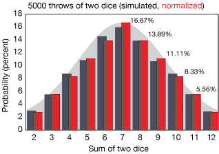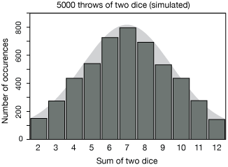 Here's another example before we move on. The graph below shows the results of 5000 simulated throws of two dice. The sum of both dice is shown. Notice that because there are more ways to come up with a total of 7 (6+1, 5+2, 4+3),it's the most probable throw. After 5000 throws, the dice-total distribution looks pretty "normal."