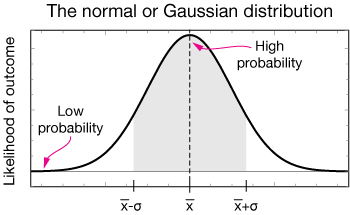 The Gaussian curve shows that the most-likely value is the mean, $\bar{x}$. We also define two points, $\bar{x} ± \sigma$, where $\sigma$ is the standard deviation and $\sigma^2$ is called the "variance of the distribution."
