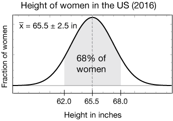 The probability of a height falling within some range of heights is given by the area under the curve between those two heights. For the Gaussian distribution, there is a specific range, $\bar{x} ± \sigma$ , which encloses 68% of the total probability. It shows that 68% of all U.S. women in 2016 had heights between 65.5 - 2.5 = 63 inches and 65.5 + 2.5 = 68 inches. In obtaining a curve like this, we tweak a small set of parameters (just $\bar x$ and $\sigma$ in this case) to fit a Gaussian curve to the data.