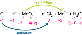 $$ \begin{align} Cl^- &\longrightarrow Cl_2 \phantom{000} \color{steelblue}{\text{oxidation}} \\[5pt] MnO_4^- &\longrightarrow Mn^{2+} \phantom{000} \color{#C5D82F}{\text{reduction}} \end{align}$$