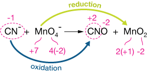 $$ \begin{align} CN^- &\longrightarrow CNO \\[5pt] MNO_4^- &\longrightarrow MNO_2 \end{align}$$