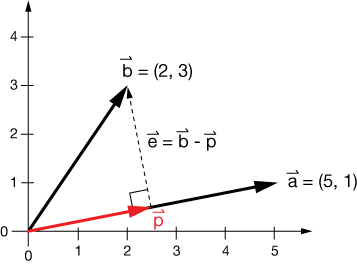 A glance at the graph of all of our vectors above should assure you that this projection seems right. We can also check it by computing the dot product of our projection $\vec p$ with $\vec e = \vec b - \vec p$: