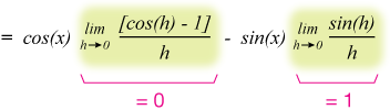 $$ = \lim_{h\to 0} \frac{\text{sin}(x)[\text{cos}(h) - 1]}{h} + \lim_{h\to 0} \frac{\text{cos}(x)\text{sin}(h)}{h}$$