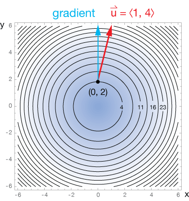 The uphill slope at $(0, \; 2)$ in the direction of $\hat u$ is $3.88$, while the steepest slope is along the blue vector, with a value of $4.0$. That steepest ascent is called the gradient. We'll encounter that just ahead.