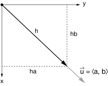 Here is a blowup of the geometry shown in yellow dashed lines in the previous figure. The unit direction vector $\hat u = \langle a, \; b \rangle$. Any vector of lenth $h$ (a scalar) can be written as $h\hat u$ or $h \langle a, \; b \rangle$.
