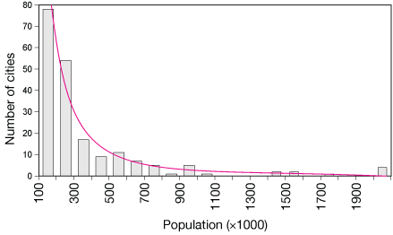 The upper graph shows the number of US cities (in 2019) grouped by population. Clearly there are many more cities of population around 100,000 people than much larger cities. This is not a Gaussian distribution at all. It's more like a decaying exponential graph.