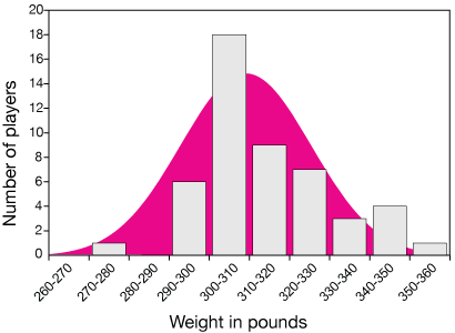 The probability of a height falling within some range of heights is given by the area under the curve between those two heights. For the Gaussian distribution, there is a specific range, $\bar{x} ± \sigma$ , which encloses 68% of the total probability. It shows that 68% of all U.S. women in 2016 had heights between 65.5 - 2.5 = 63 inches and 65.5 + 2.5 = 68 inches. In obtaining a curve like this, we tweak a small set of parameters (just $\bar x$ and $\sigma$ in this case) to fit a Gaussian curve to the data.