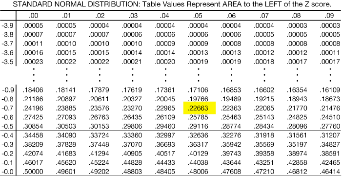 The table below is a partial example of a Standard Normal Table of Areas. Many of the rows are left out for brevity. It's important to get a feel for the table you're using. This one lists negative values on the Z-score; that's to the left of the mean. Some are a bit different. Not to worry, though, because the SND is left-right symmetric. It also lists areas integrated (added up) from the left. Looking at the table we read down the first column until we get to the first digit of our Z-score, 0.7 (ignoring the negative sign), then over across the columns until we get to the column labeled 0.05. At the intersection, we read the area from the extreme left of the distribution to the Z = -0.75 mark, 0.22663. That means that there is a 22.6% chance of obtaining an x-value of 68 or higher from this distribution.