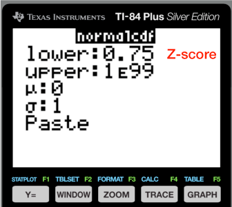 In this version of the program we can enter both limits. We'll place the Z-score, $Z = 0.75$ as the left limit. Then we want to integrate under the function far out into the wings. It's customary to put a very large number here, usually $1 \times 10^{99}$. Actually even a number like 1000 is usually fine. You choose, but test your method against an outer limit of $1 \times 10^{99}$.