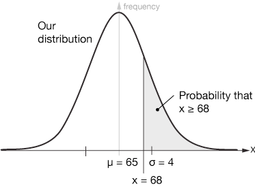 Here's an example of how the Z-score is used. Let's say that we have a Gaussian or Normal distribution with a mean of 65 and a standard deviation of $\sigma = 4$: $\bar x = 65 ± 4$. We'd like to know, for example, what the probability of obtaining a result of 68 or higher. First we calculate the Z-score for $x = 68$: