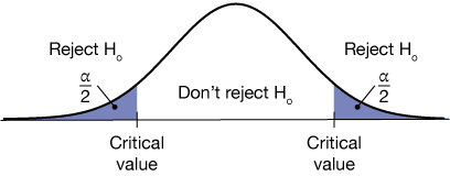 In the graph above, we are testing a hypothesis, $H_o: \mu = \mu_o$, against an alternative hypothesis $H_a: \mu \ne \mu_o$. That is, our null hypothesis is that the population mean is equal to some specified value, $\mu_o$, and our alterantive is that it is not. Notice that in this analysis, the statistic we're testing could be greater than the expected mean or smaller. We call this a two-tailed hypothesis, and we break the confidence level, $\alpha$ into two parts of size $\alpha/2$ on the left and right sides. These are labeled with a number called the critical value.