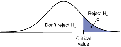 We could also have a null hypothesis $H_o: \mu = \mu_o$, with an alternative hypothesis that $H_a: \mu \gt \mu_o$. This leads to the one-tailed test in the figure below. We'll see some details of how these are constructed later in this section, but for now, if the value of the test statistic falls to the right of some critical value, we reject the null hypothesis and conclude that indeed, $\mu \gt \mu_o$.