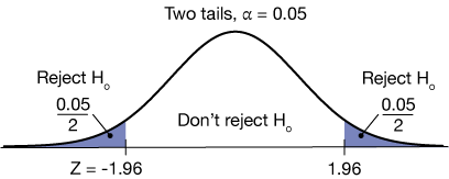 we can determine the Z-score that goes with an area of 0.025 (2.5%) on the left and right. Those values are (because of the symmetry of the normal distribution) ±1.96, as shown. Now we reject the null hypothesis if the Z-score of our test statistic is less than -1.96 or greater than 1.96.
