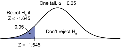 Finally, for the same null hypothesis, we could have an alternative $H_a: \mu \lt \mu_o$, leading to the one-tailed test below. In this test, if the Z-score of the test statistic is less than -1.645, the null hypothesis is rejected and we conclude that the mean $\mu$ must be less than the value $\mu_o$.