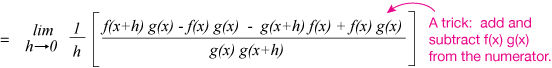 The quotient rule can easily be derived using the difference quotient and a simple trick. Start by writing out the difference quotient for, $f(x)/g(x)$. This derivation is really just like that of the product rule in another section.