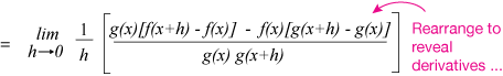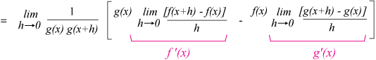 $$= \lim_{h\to 0} \frac{1}{g(x) g(x + h)} \left[ \frac{g(x)[f(x + h) - f(x)]}{h} - \frac{f(x) [g(x + h) - g(x)]}{h} \right]$$