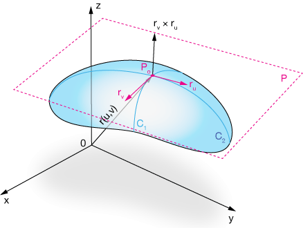 Any point on the surface is given by vector $vec r(u,v)$, where $u$ and $v$ arhe the parameters Coordinates $x, \; y$ and $z$ are all functions of $u$ and $v$. We can find the partial derivatives of $\vec r$ in the $u$ and $v$ directions at point $P_o$ like this: